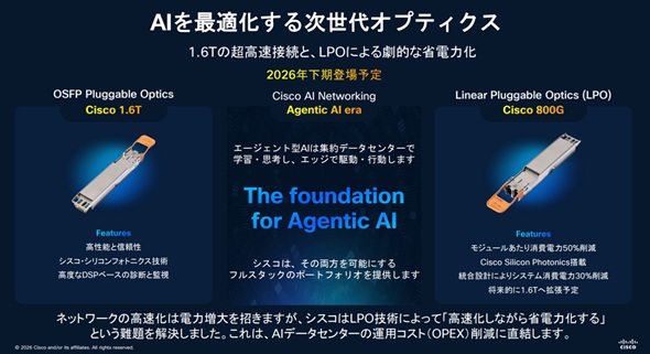 この他、日本におけるAI利用の障壁の一つが「電力確保」だ。シスコはこれに対し、光学技術(シリコンフォトニクス)を駆使した解決策を提示した。デジタル信号プロセッサ(DSP)を排除し、シリコンチップ側で処理を最適化する「LPO(Linear Pluggable Optics)」モジュールを採用することで、システム全体の消費電力を約30%削減する。これは環境負荷低減とビジネス成長を両立させる、同社のサステナビリティ戦略の核心部分でもある。
