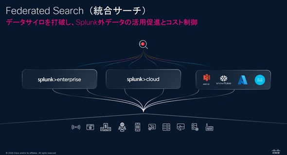 これまで多様なデータソースをSplunkに集約させるのには時間も手間もかかった。これに向けた解決策としてシスコが提唱する新しい概念・アーキテクチャが「Cisco Data Fabric」だ。Cisco Data Fabricは、Splunk製品に搭載されたフェデレーション機能「Splunk Federated Search」をコアとし、「Amazon S3」や「Snowflake」内の各データをSplunkに移動させることなく検索・分析できる。これによって日本企業はデータ主権を守りつつ、完全な可視性を手に入れられる。
