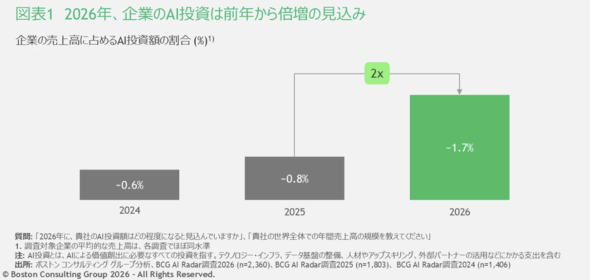 BCGは、企業のAI投資が売上比1.7%へ拡大し、AIエージェントに3割超を配分する見通しを示した。この投資を成功させ競争力を向上させるために、企業トップに求められる姿勢とは。