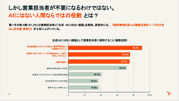 一方で、図2に示すように、買い手の約8割(81.2%)は営業担当者だからこそ提供できる価値に期待を持っている。中でも「個別事情を汲(く)んだ提案」「潜在ニーズの引き出し」「共感や気配り」が、生成AIにはない価値として営業担当者に求められていることが分かった。