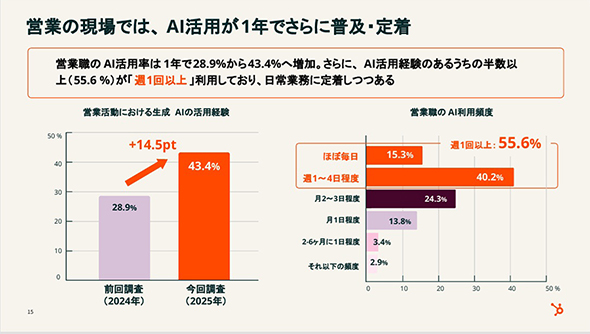 左のグラフにあるように、営業担当者および営業責任者の生成AI活用率は1年で28.9%から43.4%へと14.5ポイント増加した。さらに右のグラフにあるように、生成AI活用経験のある人の半数以上(55.6%)が「週1回以上」利用しており(ほぼ毎日15.3%、週1〜4日40.2%)、日常業務への定着が進んでいることが分かった。