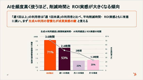 生成AIの利用頻度と実感する成果の関係を見ると、生成AIの利用頻度が高いほど業務削減時間と有料AIツールのROI実感率がともに高くなる傾向が見られた。生成AIをほぼ毎日利用する人は週当たり約3.6時間を削減し、有料ツールのROI実感率が71%である一方、月1日の利用者は削減時間が約1.3時間、ROI実感率は25%にとどまった。同社はこの結果について、「まず生成AI利用を習慣化することが、成果実感の入り口となることが示唆されている」と見ている。