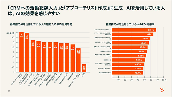 企業のAI活用においてビジネスの成長に直結するものの一つに、営業業務への適用がある。営業部門の生産性向上は業務の効率化もさることながら、どれだけ契約を獲得し継続できるかの決め手にもなるからだ。果たして「営業×AI」の勘所はどこにあるのか。CRM(顧客情報管理)を中心としたソフトウェアベンダーのHubSpot Japanがまとめた調査結果から考察する。