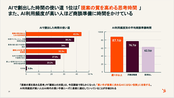 同社はこの結果について、「提案の質を高める思考や顧客との対話は、(図2に示した)買い手が営業に求める生成AIにはない価値と合致しており、創出時間が買い手のニーズに応える方向に再投資されている可能性がある」との見方を示している。