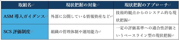 このようにASMが“外部に公開している情報資産など”を可視化するのに対し、SCS評価制度は“組織の管理体制や運用能力”を現状把握し、評価する枠組みであるという点において、両者は補完関係にあります。ASM導入ガイダンスとSCS評価制度のそれぞれが示す現状把握のアプローチの対比を以下の表に示します。