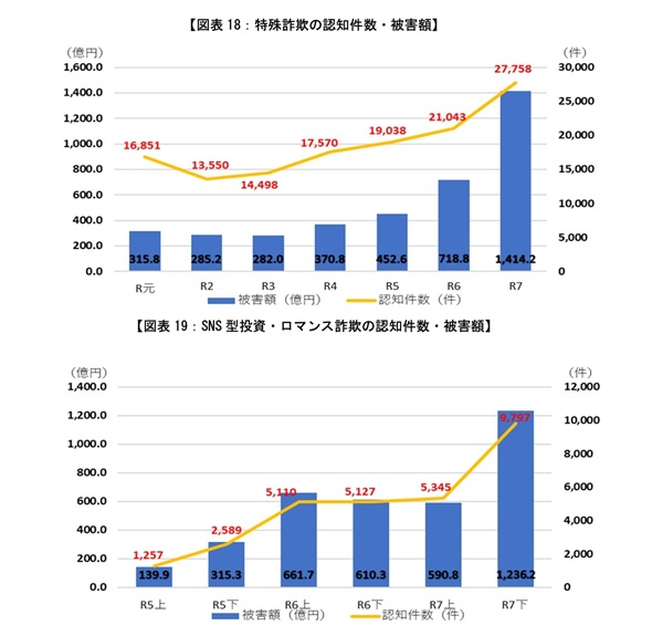 同ドキュメントの「インターネット空間を悪用した犯罪に係る脅威情勢」(P23)では、インターネット詐欺に関する相談や犯罪が生々しく記されています。2025年の特殊詐欺の被害額は約1414億2000万円(前年同期比96.7%増)と、過去最悪となった2024年の被害額を上回り、SNS型投資・ロマンス詐欺の被害額についても約1827億円(前年同期比 43.6%増)と前年を大きく上回っています。目の前にある犯罪行為として無視できません。