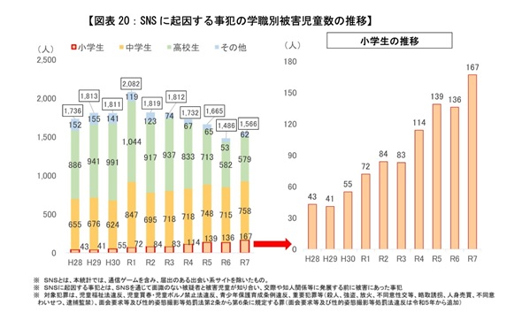 個人的に非常に懸念しているのは、その矛先が子どもたちにも向かっていることです。この資料ではSNSに起因する事犯の学職別被害児童数の推移も記されており、「特に小学生の被害児童数が近年増加傾向にあり、被害児童の低年齢化の傾向が見られる」(P26)としています。このグラフは大変つらい内容でした。