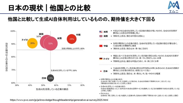 下野氏が紹介したデータによると、日本は生成AIを活用している企業の割合こそ平均的な水準にあるものの、生成AIを活用して期待以上の効果を得た企業の割合は他国を下回るという。米国および英国はそれぞれ51%、50%の企業が期待を上回る効果を実現している。ドイツで28%、中国で24%となっているが、日本は13%しか期待以上の効果を得られていない。