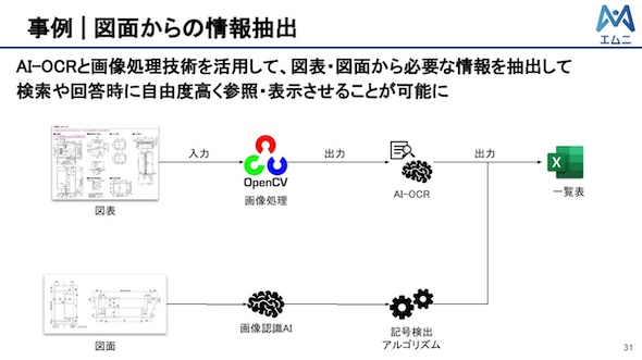 「オンプレミスでは前処理の精度を高めるために工数がかかるが、これは前処理に関連する工程の柔軟性が高いという意味でもある。例えば、AI-OCRと画像処理技術を活用して、図表や図面から必要な情報を抽出して、検索や回答の際に柔軟に参照させることも可能だ」