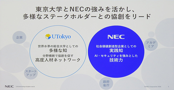 あらためて、冒頭で紹介したNEC東大ラボが掲げるビジョンは、非常に重要だが難しいチャレンジになる。両者による強力なタッグのもとで両者の多様なネットワークを活用する取り組みには期待したいが、果たして本当に世の中にインパクトをもたらすことができるのか。例えば、先行テーマに挙げるAIエージェントについてはすでに有力なプレーヤーがグローバルで実績を上げつつある。そうしたプレーヤーを巻き込んでいく必要があるのではないか。そんな疑問が頭に浮かんできたので、会見の質疑応答で聞いてみた。すると、NECの森田氏は次のように答えた。