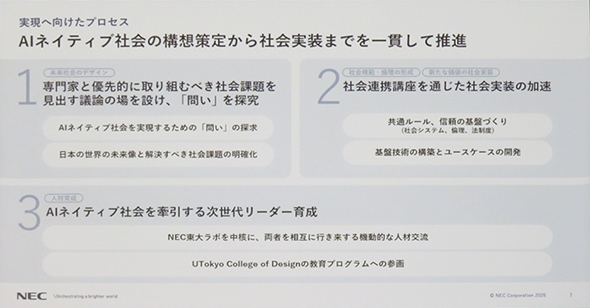 新たに発足するNEC東大ラボは、同協定に基づく共同活動の実行母体として、「多様なステークホルダーによる議論の場での“問い”の探究」「社会連携講座での社会実装に向けた活動」「AIと共生する信頼社会の実現をけん引する人材の育成」といった3つの取り組みを一体で推進する。