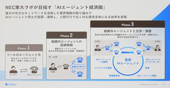 とりわけ、2つ目の取り組みにおいて、NEC東大ラボでは上記のポイントの説明でも取り上げたAIエージェント経済圏の健全な形成に先行テーマとして取り上げる。この点について説明した森川氏によると、AIエージェントはこれから図3に示すように、「ツールのエージェント化」「組織内エージェントの協調稼働」「組織外エージェントと交渉・調整」といった段階を踏んで進展していくとの見方に基づき、「東京大学の中立なネットワークを活用した業界横断の取り組みでAIエージェント同士が協調、連携し、人間だけでなくAIも経済主体になる世界を実現していきたい」と述べた。