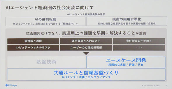ただし、そうしたAIエージェントの経済圏の社会実装に向けて不可欠なのが、今回のキーワードである「信頼」だ。森川氏は図4を示しながら、「技術開発だけでなく、実運用上の課題を早期に解決することが重要だ。そのために、NEC東大ラボではユースケースの開発、共通ルールと信頼の基盤づくりに重点を置いて活動していく」と説明した。