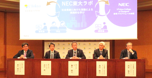 東京大学とNECは2026年3月17日、「AIと共生する未来の協奏−信頼ある社会実装に向けて−」をビジョンに掲げ、人とAIが豊かに共生する信頼社会の実現に向けて産学協創協定を締結し、「NEC東大ラボ」を設置すると発表した。同日、東京大学内で開かれた発表会見には、東京大学から藤井輝夫氏(総長)、津田敦氏(理事・副学長)、森川博之氏(大学院工学系研究科 教授)、NECから森田隆之氏(取締役 代表執行役社長 兼 CEO)、西原基夫氏(執行役Corporate EVP 兼 CTO)が登壇した。