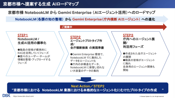 そこでDSKが提案し、京都市と合同で検証を進めているのが、Google CloudのAIエージェント基盤、Gemini Enterpriseによる全庁統合AIアシスタントの実現だ。