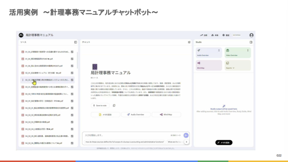 計理事務に関わる膨大なマニュアルをNotebookLMに読み込ませてAIチャットボットを作成した。職員は、例えば「京都市から100キロ圏内の市町村に出張する場合の旅費の取り扱いをまとめて」と質問するだけで正確な情報を得られるようになった。