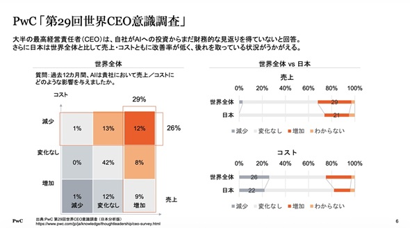 村上氏ははじめに、PwCの「第29回世界CEO意識調査」を基に、生成AIへの投資に対する現状の見返りを解説する。調査によると、「AI投資から十分な財務的リターンを得ている」と回答したCEOは全体の4分の1程度で、売上上昇とコスト削減の両方を実現できている企業はわずか12%にすぎなかった。