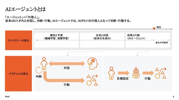 テクノロジーの進化は、従来の機械学習による「識別・予測」から、生成AIによる「生成・対話」を経て、AIが自ら目標達成のために動く「自律・行動」の段階、すなわちAIエージェントの世界へと突入している。