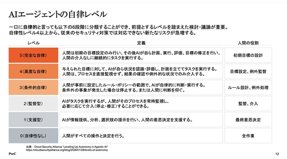 村上氏はAIエージェントの自律レベルを、自律性がない「レベル0」から完全自律の「レベル5」までの6段階で定義する。「レベル2」では人間が監督として確認するプロセスを定義できるが、人間がプロセスを直接監視しなくなる「レベル3(条件的自立)」や「レベル4(高度な自律)」以上に達したとき、従来の人間中心の統制は無効化されてしまう。