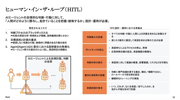 村上氏はこの事案を踏まえ、誰が、何をできるのかという「非人間アイデンティティー」、何が起きているか、人間はどう関与するかというヒューマン・イン・ザ・ループ(HITL)、AIが外の世界とどう安全に接するかという「外部環境との相互作用」の3つを主要論点として整理している。