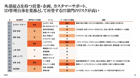 日本企業のAI活用特性とリスク要因を掛け合わせた分析によると、カスタマーサポート、IT部門(ヘルプデスク)、営業・企画の3分野のリスク評価が「最高」となっている。これらは顧客の個人情報へのアクセス権や外部への発信権限を持つためだが、中でも特筆すべきはIT部門のリスク構造だ。