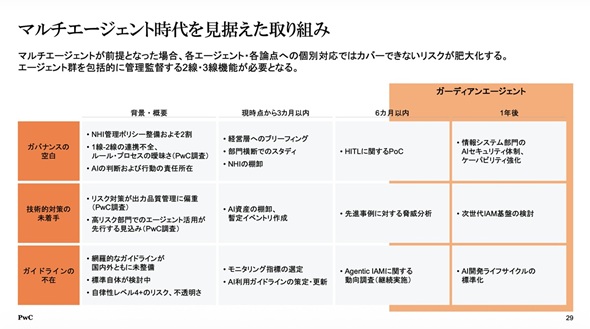 複数のエージェントが複雑に連鎖する「マルチエージェント」環境において、個別の「点」の対策で残存リスクを制御することは困難だ。村上氏はその対策として、組織内のエージェントを横断的に監視・統制する「ガーディアンエージェント」の導入を推奨する。これは企業を管理、監督する「第2線、第3線」の役割をAI自身に担わせ、エージェント間の不審な挙動やポリシー逸脱をリアルタイムで検知・遮断するものだ。