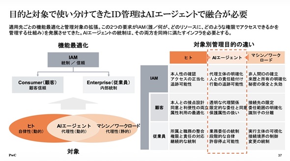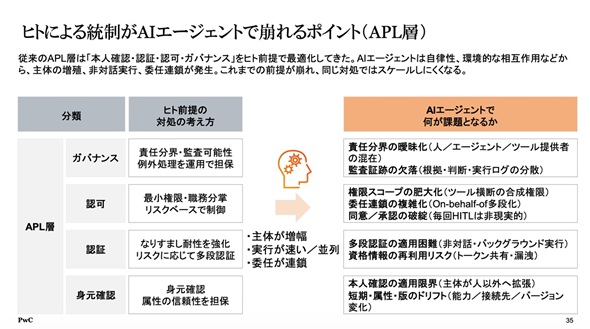 さらに重要な変化はID特性の変容だ。これまでのAI利用は人間ユーザーのセッションに従属していたが、AIエージェントは「ノンヒューマンアイデンティティー」として、独自の権限を持つ主体となる。村上氏は、エージェントが自らIDを持つという点において「そのIDをどう管理しているかという論点が生まれてきている」と指摘する。