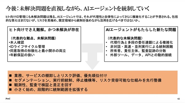 IETFなどの標準化団体では、2026年3月6日版のドラフトにおいてAIエージェントのための認証・認可に関する議論を開始しており、既存技術の流用による解決可能性も模索されている。しかし標準仕様の確立には時間を要するため、柴田氏は「標準化を待つのではなく、企業は現時点から必要な論点を確認し、独自の実装を含めたガバナンス構築に着手すべき」と話す。