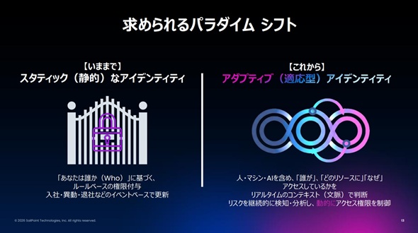 SailPointテクノロジーズジャパンの松本修也氏(ソリューションエンジニアリング本部本部長)は、こうした状況に対し、「従来の静的なアイデンティティー管理ではなく、日々変化する脅威に対してAIと自動化を活用し、動的に最適化し、適用していく『アダプティブ・アイデンティティー』へのパラダイムシフトが必要です」と述べる。