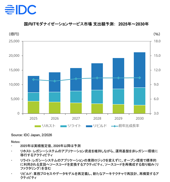 IDCは国内ITモダナイゼーションサービス市場の2025〜2030年の年間平均成長率(CAGR)を10.2%と予測しており、2030年の市場規模は2兆1234億円に達するとしている。