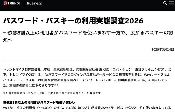 2026年3月、トレンドマイクロが「パスワード・パスキーの利用実態調査2026」を発表しました。