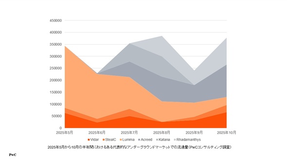 以下は、2025年5〜10月の半年間におけるある代表的なアンダーグラウンドマーケットでの流通量を示したものです。今日、代表的なインフォスティーラーである「Vidar」「StealC」「Lumma」「Acreed」「Katana」「Rhadamanthys」の6種ごとのデータとなります。月によってインフォスティーラーごとの規模は異なるものの平均30万件程度の情報が流通していることが分かります。