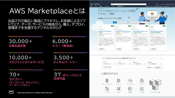 AWS Marketplaceは、AWSのユーザー企業がサードパーティーのソフトウェアやサービスを調達できるマーケットプレースだ。3万件を超える製品と1万件を超えるサービスが登録されており、モニタリングやセキュリティ、データベースなど70種類以上のカテゴリーをそろえる。
