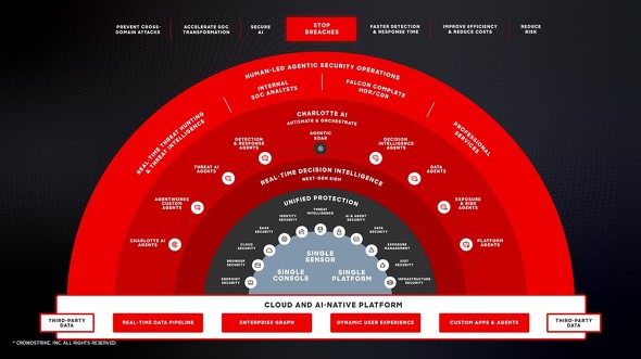 隙間のないセキュリティ対策を実現するためにクラウドストライクが提案するのが、エンドポイントセキュリティを起点にさまざまな防御機能を備える「CrowdStrike Falconプラットフォーム」(以下、Falconプラットフォーム)だ。FalconプラットフォームはAIネイティブの軽量な単一エージェントで、複数のセキュリティ機能を提供するシングルプラットフォーム構成を特徴とする。同社が世界中から収集・分析する脆弱(ぜいじゃく)性情報などのセキュリティデータやインテリジェンスをFalconプラットフォームに活用している。
