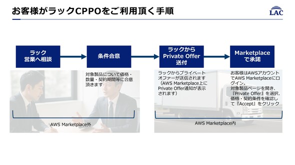 CPPOにおける契約プロセスは「非常にシンプルで透明性が高い」と鈴木氏は説明する。まずは購入したい製品や数量、契約期間をラックの営業担当者に相談して、価格や条件に合意する。ここまでがAWS Marketplaceの外でのやりとりだ。その後、ラックはAWS Marketplaceでユーザー企業向けのプライベートオファーを提示する。最後にユーザー企業の担当者がAWSアカウントでログインし、そのオファーを承諾することで契約が成立する。
