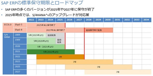 保守期限切れになることで、SAPから定期的に配信されるパッチの提供が停止し、税制改正などが生じた場合に自前で対応しなければならないため事業継続のリスクになる。