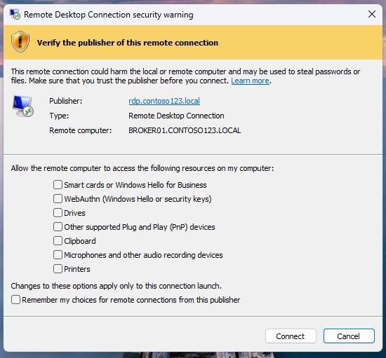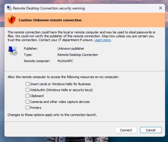 その後、RDPファイルを開くたびに接続前の確認画面が表示される。この画面には接続先のアドレスや、ローカル資源へのアクセス要求が一覧で示される。ドライブやクリップボード、カメラなどの共有項目は初期状態では全て無効となっており、必要なものだけを利用者が明示的に有効化する必要がある。