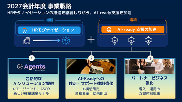 「HRモダナイゼーションの推進を継続しながら、AI-ready支援を進展させる」ことを掲げ、戦略として追加したAI-ready支援の具体策として、「包括的なAIソリューションの提供」「AI-readyへの伴走・サポート体制の強化」「パートナービジネスの強化」の3つを挙げた。