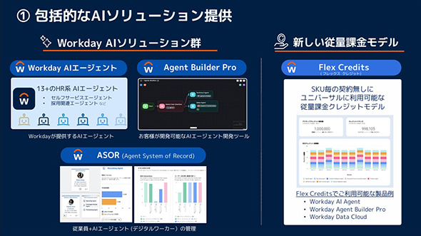 Workdayが現在提供しているAIソリューションは、HR系AIエージェントをはじめ、ユーザーがAIエージェントを開発できる「Agent Builder Pro」、従業員とAIエージェントを一元管理できる「ASOR」(Agent System of Record)から構成されている(図5左)。図5の右に記されている新たな従量課金モデル「Flex Credits」は、「SKU(Stock Keeping Unit)ごとの契約無しで、ユニバーサルに利用可能な従量課金クレジットモデル」だ。今後のAIエージェントの料金モデルに一石を投じるものになるだろう。