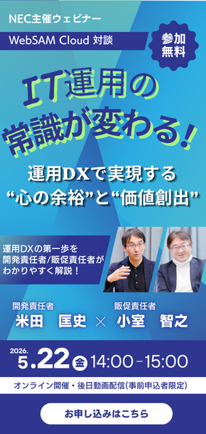 NECは2026年4月以降、WebSAM Cloudの機能限定版を利用期間の制限なく無料で試せる「フリーミアムモデル」の提供を開始した。効果を実感した後は有償プランに段階的にアップグレードできる仕組みも整っており、「運用DX」を検討する企業にとって選択肢の一つとなりそうだ。