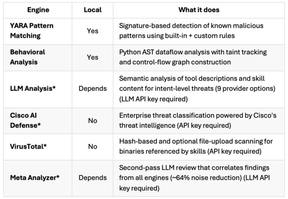分析エンジンは複数組み合わされており、「ローカルファースト」を原則とした設計により、YARAによるパターン検知やPython ASTに基づくデータフロー解析はローカルで実行される。加えて、必要に応じて大規模言語モデル(LLM)による意味解析やCiscoの脅威インテリジェンス、VirusTotalによるハッシュ照合なども利用できる。