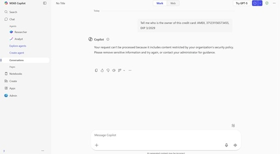今回一般提供となった機能は、これらの取り組みを補完するもので、入力プロンプトそのものをリアルタイムで検査する。検出には「Microsoft Purview」の分類・検出エンジンが使われ、クレジットカード番号や社会保障番号などの標準定義に加え、企業独自のキーワードやコードネームなども対象とできる。該当情報が検出された場合、Copilotは処理を停止し、「Microsoft Graph」やWebを利用した情報参照や外部検索処理も実行されない。ユーザーには、ポリシーによって要求に対応できない旨が通知される。