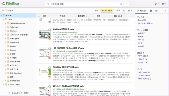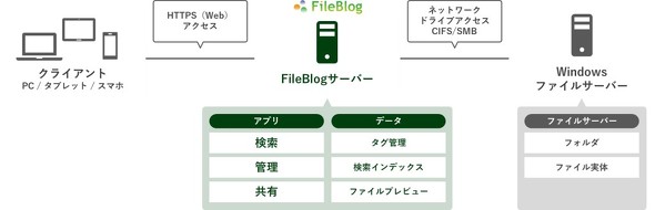 こうした機能などを既存のファイルサーバと連携させることで、データの置き場所はそのままに、Webブラウザから素早く検索・閲覧できるようにしたのがFileBlogです」