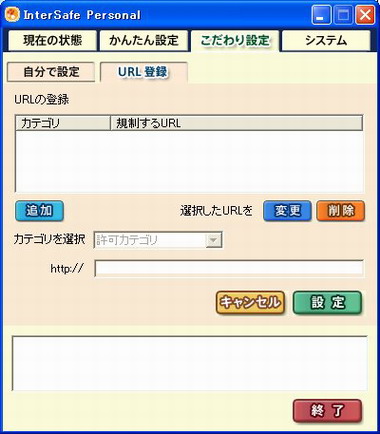 これらのURL情報はサーバ側で常時アップデートされており、自動アップデート機能もあるので、最新の情報を元に規制をかけることができる。ただし、中には訪れてほしくないサイトが表示されてしまう場合もあるだろう。そのときには、先ほどの管理画面にある「こだわり設定」から、URLを自分で登録して利用することも可能だ。