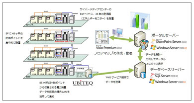 分電盤に設置した計測装置(左、赤枠内)。計測データはSQL Serverのデータベースに蓄積され、分析結果はSharePointを使って配信する。“見える化”する部分のサーバは仮想化しており、「保守が簡単になった」(間下氏)とのこと計測は10分ごとに行われ、1日当たりの計測データは約13万件になる。実証実験は2010年12月に始まり、現在まで数千万件のデータを蓄積している。