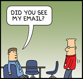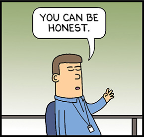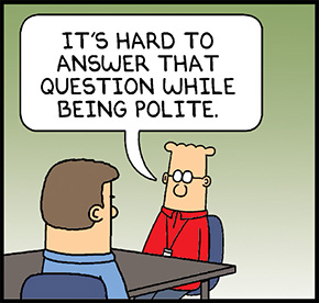 どう返答をしてよいか迷うメールを受け取ったディルバート。返事を書けない理由は、聞かれても正直に言わず、“大人の対応”をしておくべきだったのかも……