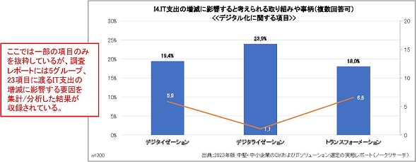 一般的にDX(デジタルトランスフォーメーション)関連の取り組みは、「デジタイゼーション」「デジタライゼーション」「トランスフォーメーション」の3つの進展段階に分けて論じられる。ただし、中堅・中小市場では、必ずしもこの順でIT支出額が増えるわけではないことが今回の調査から明らかになった。