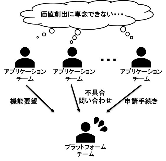 アプリケーションチームの数が増えると、各チームからプラットフォームチームに対する異なる要望が増え、プラットフォームチームはどの要望に優先的に応えるべきか判断できなくなる。加えて、アプリケーションで生じた不具合について、原因切り分けのためのコミュニケーションに忙殺されるようになる。また、セルフサービス型の機能提供ができていない部分の申請や、セキュリティコンプライアンス要件の適応についても負担が増え、アジリティというメリットが失われる(図2)。