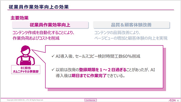 この取り組みによる効果として、同氏は「従業員作業効率向上」と「品質および顧客体験改善」を挙げた。従業員作業効率向上については、コンテンツ生成を自動化することにより、作業負荷およびコストを削減し、「生成AI導入後、セールスコピー検討時間工数を60%削減した」(中山氏)という(図3)。