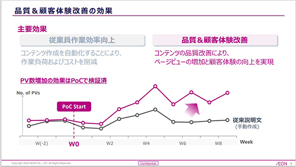 また、品質および顧客体験改善については、コンテンツの品質改善によりページビュー(PV)の増加と顧客体験の向上を実現した。図4の下段のグラフは、PV数増加の効果をPoC(実証実験)で検証した結果だとしている。